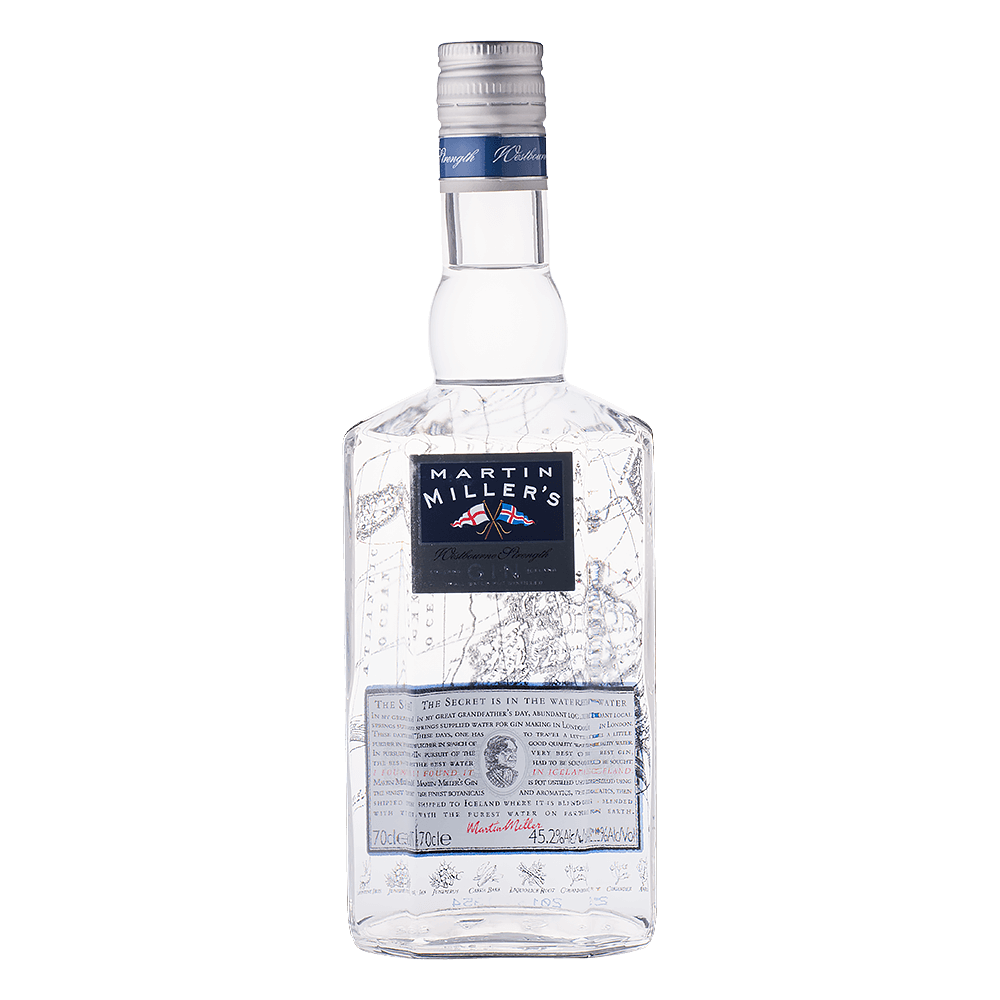マーティンミラーズ・ジンは、自分たちの理想のジンがないことに思い立ったロンドンの著名な骨董商“マーティン・ミラー”とその友人二人が手がけたプレミアム・イングリッシュ・ジン。世界中から厳選して集められた10種類以上のボタニカル(ジュニパー・ベリー、コリアンダー、リコリス、レモンとオレンジの皮など)を漬け込んだスピリッツを、連続式蒸留に比べ低い温度で蒸留し、アロマ、フレーヴァー・オイル、その他成分を穏やかに抽出。