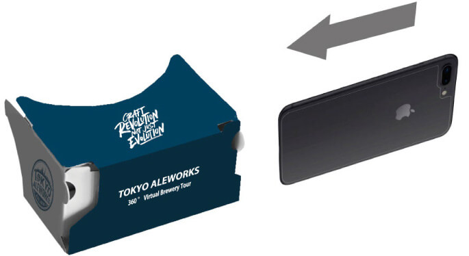 簡易VRゴーグル(組立式)は、A4サイズの折りたたんだ物を組み立て簡単に使用できます。お持ちのスマートフォンで、Youtube配信動画のVR対応のTOKYO ALEWORKSの配信コンテンツを再生し、スマートフォンをVRゴーグルに装着すれば、いつでもどこでも「360°バーチャル・ブリュワリーツアー 」を体験いただけます。