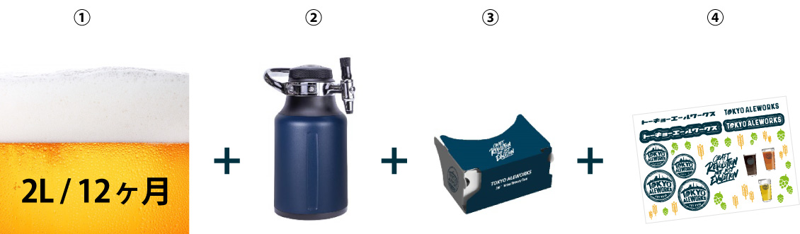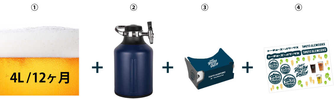 東京エールワークスでは、より多くのクラフトビールのビアスタイルを楽しんで頂くことをコンセプトにおき、IPA やベールエール、スタウトなどのベーシックなスタイル以外にも、より多くのこだわりのビールスタイルを毎月定期的にお届けする、「2リットル半年コース」、「2リットル年間コース」、「4リットル半年コース」と「4リットル年間コース」の 4 つのコースをご用意しました。